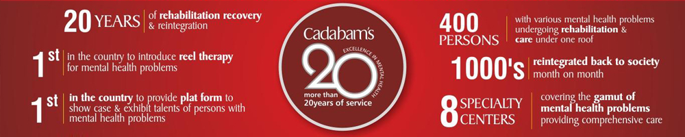 21 years into mental health care CADABAM’S is recognised as pioneers in private mental health care services. Being the biggest psycho social rehabilitation centre of the country with 7 Specialty centres of excellence, internationally accepted evidenced based programs for holistic recovery of persons with mental health problem. CADADABAM’S today is home to 400 persons with mental health problems undergoing rehabilitation and care under one roof hailing from different parts of the country and around the world. CADABAM’S has credit of rehabilitation 1000’s back into main stream of society.